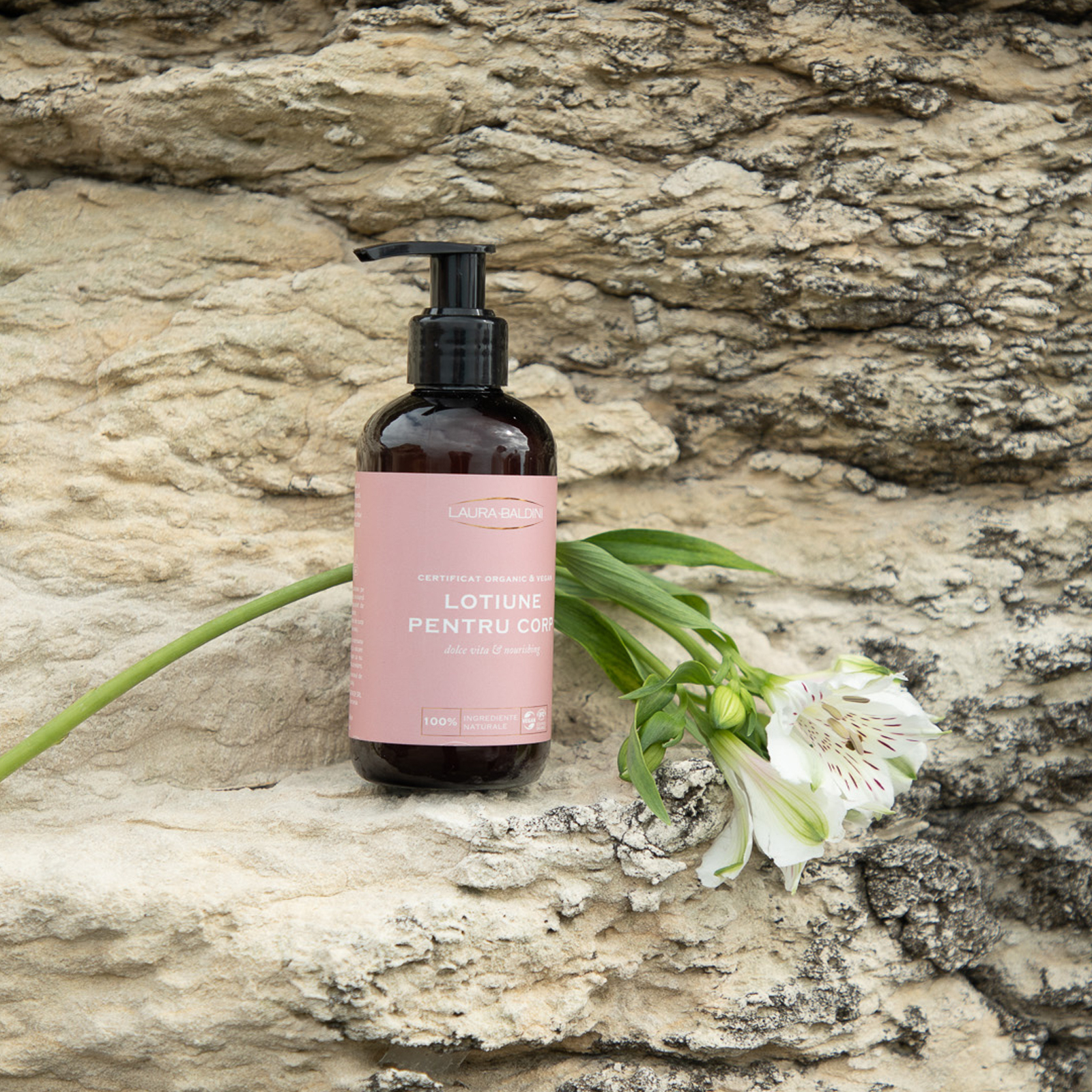 Lotiune nutritiva de corp Dolce Vita, cu aloe vera si pulbere de radacina de Konjac, 200 ml. Certificata ORGANIC & VEGAN. Contine 100% ingrediente de origine naturala si lasa un miros placut cu note dulci si exotice. Hidrateaza, calmeaza si catifeleaza pielea. Formula imbogatita cu aloe vera si extract de pulbere de radacina de Konjac permite o hidratare eficienta, lasand pielea moale si neteda.