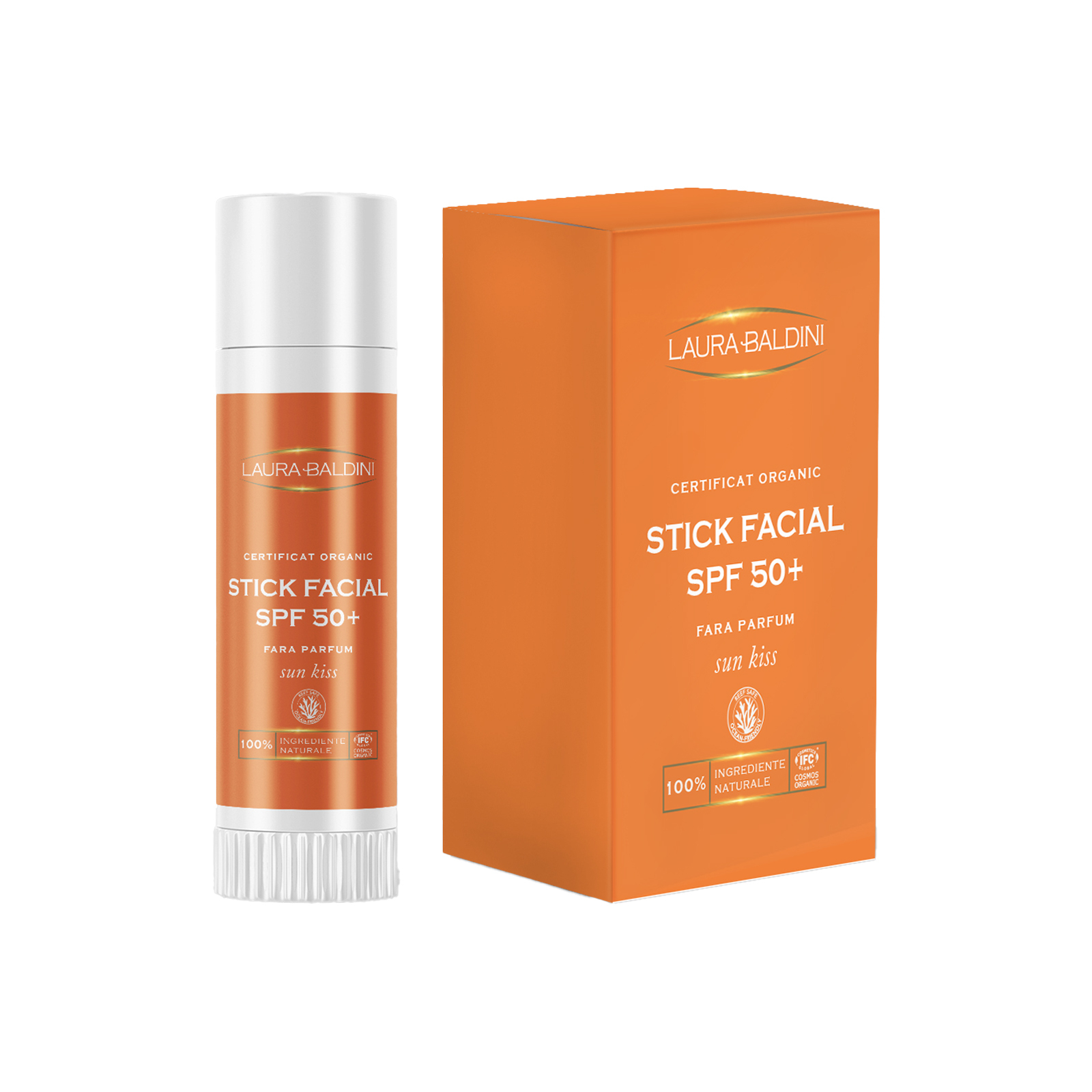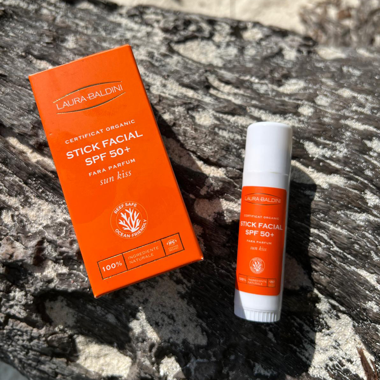 Stick facial Sun Kiss, cu protectie solara foarte ridicata SPF50+,15 ml. Certificat VEGAN & REEF SAFE. Contine 100% ingrediente de origine naturala, fara parfum. Creat pe baza de ceara de albine, are un efect intens hidratant si hranitor, fiind indicat mai ales pentru pielea uscata. Are un spectru foarte inalt de protectie UVA/UVB cu proprietati PA++++. Contine 100% filtre de protectie minerale naturale (non-nano). Protejeaza pielea impotriva radicalilor liberi. Textura foarte fina este ideala ca baza pentru machiaj.Fara efect gras sau urme albe pe fata. Potrivit pentru orice varsta, contine 100% filtre minerale naturale, deci este potrivit pentru copii si femei gravide. Sigur pentru ocean.