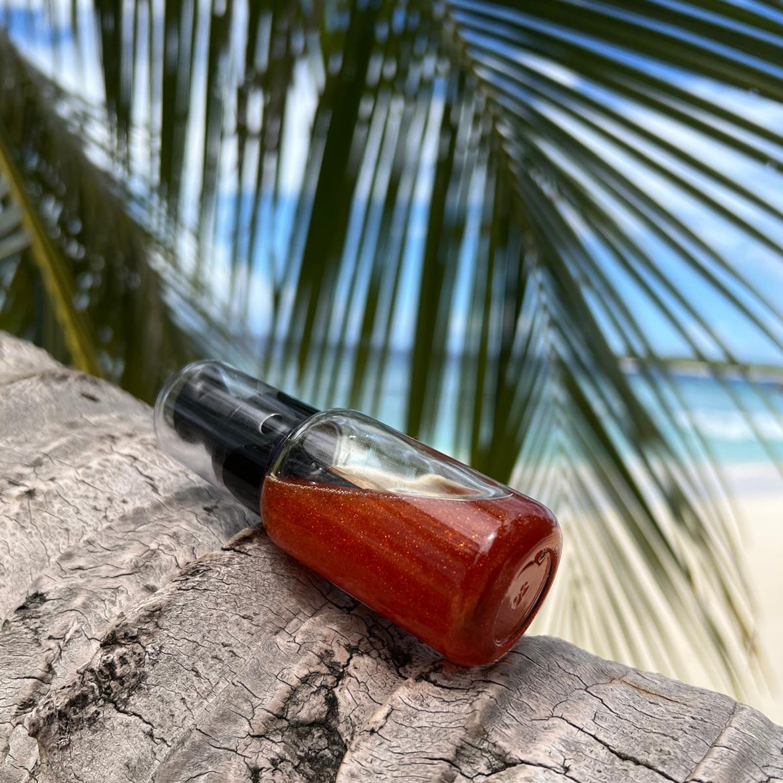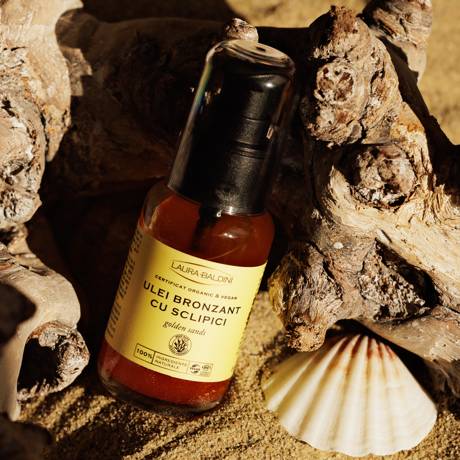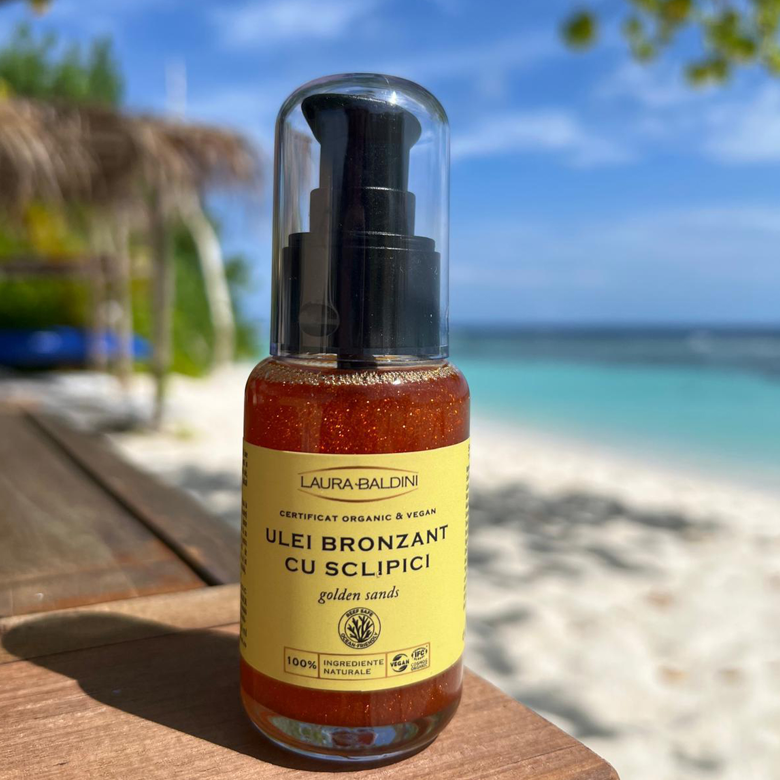 Ulei cu sclipici Golden Sands, 50 ml. Certificat ORGANIC & VEGAN & REEF SAFE. Contine 100% ingrediente de origine naturala, potrivit pentru bronzare perfecta, miros placut de vanilie, efect intens hranitor. Contine unt de cacao si ulei de buriti care ofera o protectie excelenta impotriva radicalilor liberi in timpul expunerii la soare. Potrivit pentru orice varsta, inclusiv pentru copii si femei insarcinate, sigur pentru ocean.