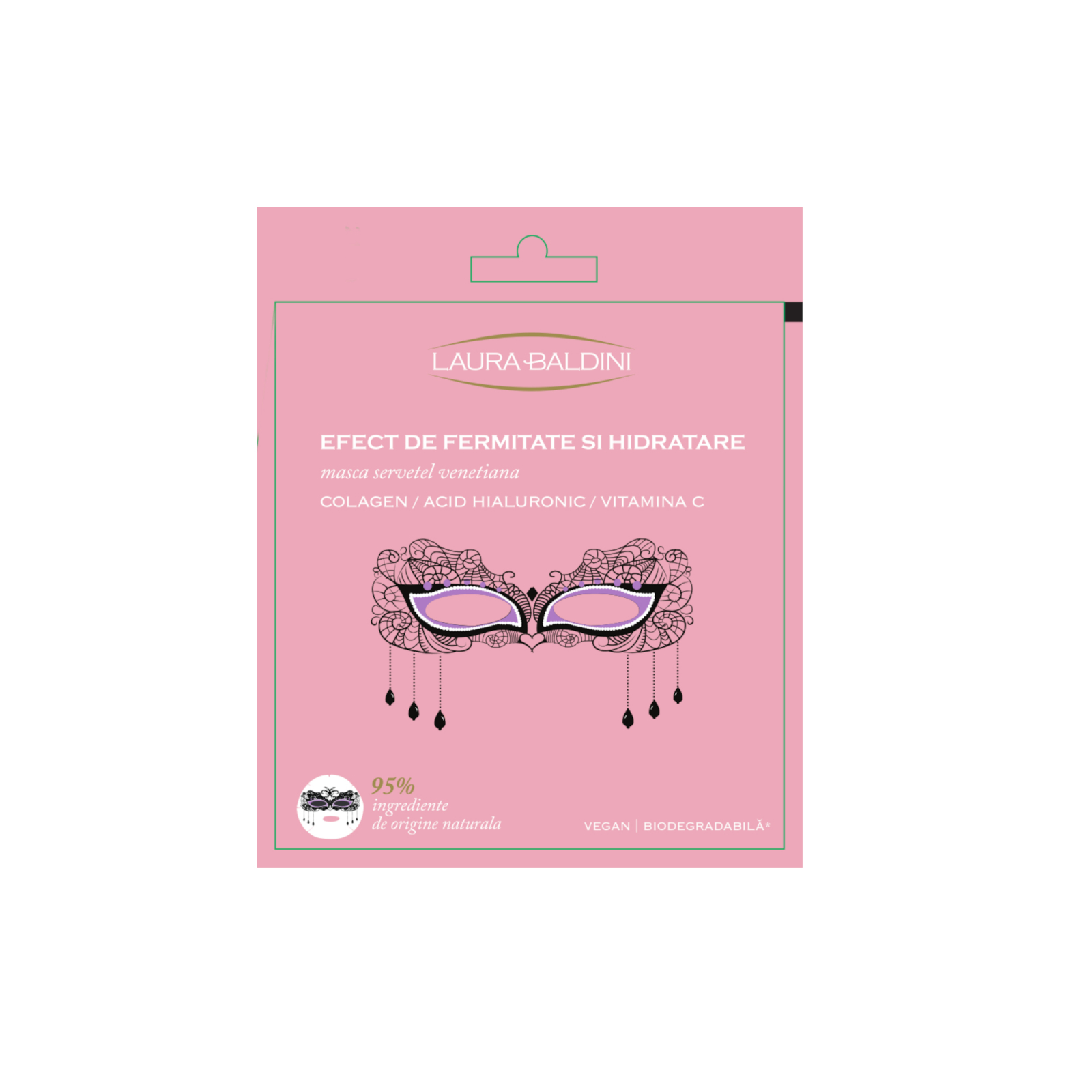 Masca servetel venetiana cu colagen, acid hialuronic si vitamina C. Certificata VEGAN. Contine 95% ingrediente de origine naturala. Formula imbogatita cu colagen, acid hialuronic, vitamina C, argila si ser relaxant ajuta la indepartarea petelor de pe piele, contribuie la uniformizarea culorii ei si la prevenirea formarii liniilor fine cu ajutorul colagenului din continut. Dupa 10 minute de aplicare, pielea devine neteda si plina de vitalitate. Purifica si remineralizeaza pielea, absoarbe impuritatile si secretiile in exces si ii confera finete si o textura placuta.
